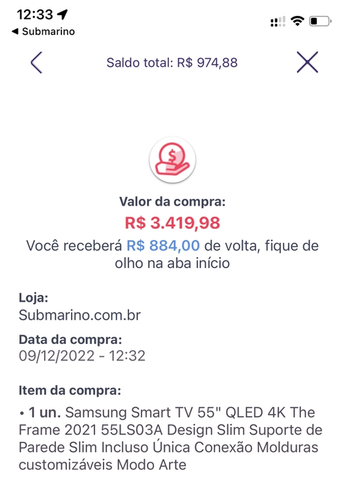 PARA APARECER O VALOR DO CASHBACK TEM SER PELO APLICATIVO SUBMARINO.