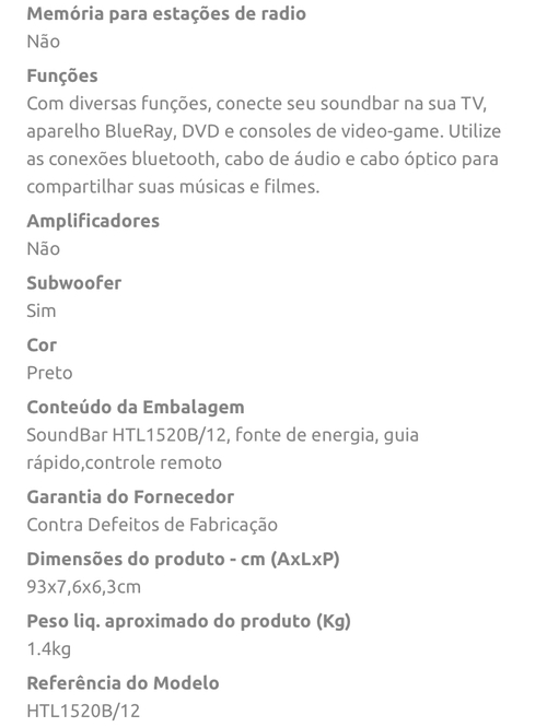 [AME SC R$273,79] Soundbar + Subwoofer Philips HTL1520B/12. Wireless/Bluetooth/HDMI ARC/CABO ÓPTICO