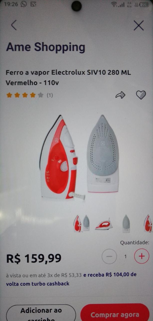 (Ame SC R$ 55) FERRO A VAPOR ELECTROLUX SIV10 280ML VERMELHO 110 e 220V
