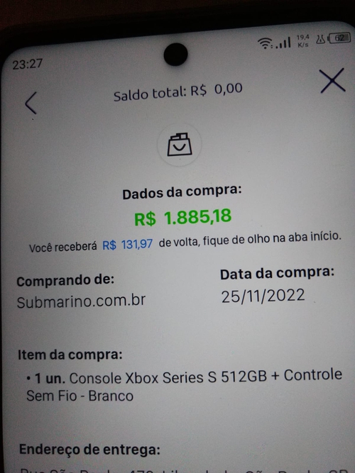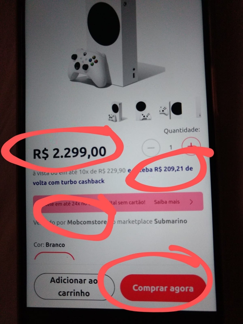 No AME Shopping pesquisar Xbox série s procurar pelo valor de 2299 e cashback 209,21 vendido MOBCOMSTORE entregue pelo SUBMARINO, clica comprar agora e o valor de R$ 1885,18 em 1x AME Super Caçador receberá R$ 131,97 apontará somente na página de pagamento do AME