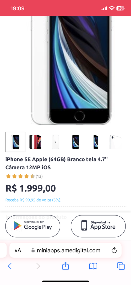 ( Ame Shopping R$ 960) iPhone SE 64 GB branco tela 4.7 Cam 12mb ios