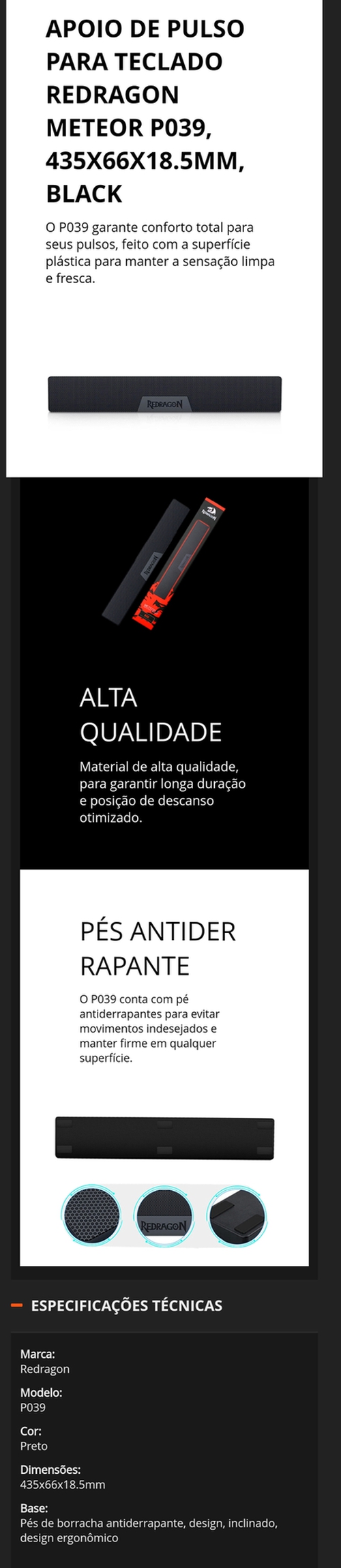 Apoio De Pulso Para Teclado Redragon Meteor P039, 435x66X18.5mm, Black
