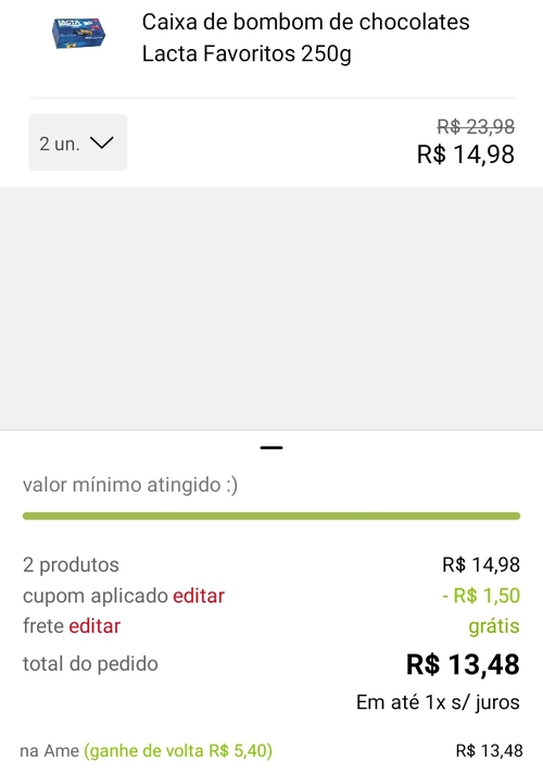 Necessário adicionar 2 unidades ao carrinho e cupom, totalizando 13,48