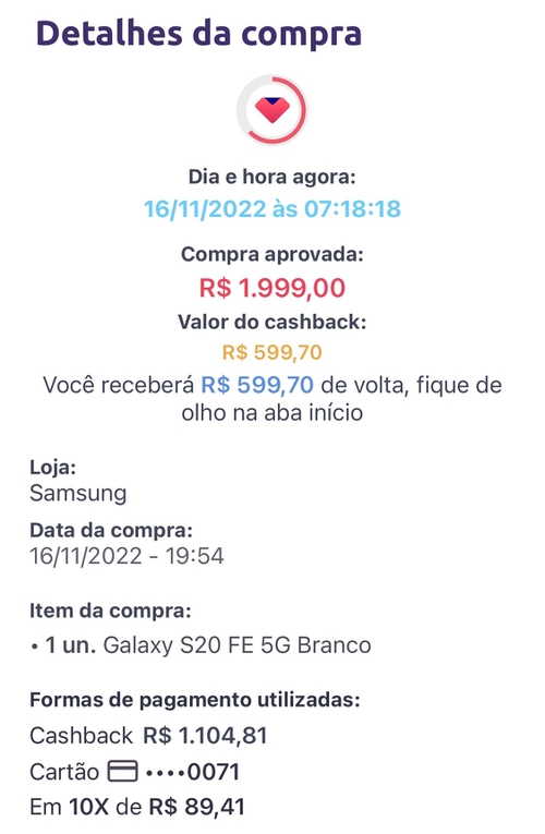 Comprei... Ficou R$1.999,00 podendo parcelar e voltou R$599,70 de Cashback...