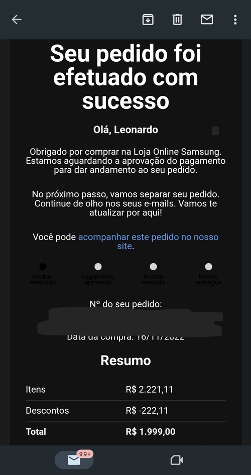 Ou seja... Saiu por R$1.399,30Tentei comprar 20 vezes, em todas o app dava um erro aleatório diferente. Que porcaria de app essa loja da Samsung.