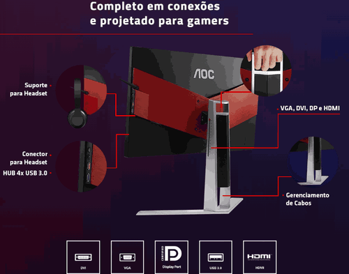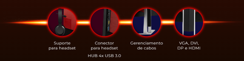 Conexões: 1x VGA, 1x DVI Dual Link, 1x HDMI 1.4, 1x HDMI 2.0, 1x Display Port 1.2, 4x USB 3.0, 1x Entrada para Headset, 2x Entradas de Áudio, 1x Saída de Áudio e 1x Mini-USB (Controle gamer externo)