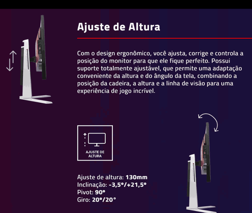 Base ajustável: Altura: 130mmGiro: 20°/20°Inclinação: -3,5°/+21;5°Pivô: 90°