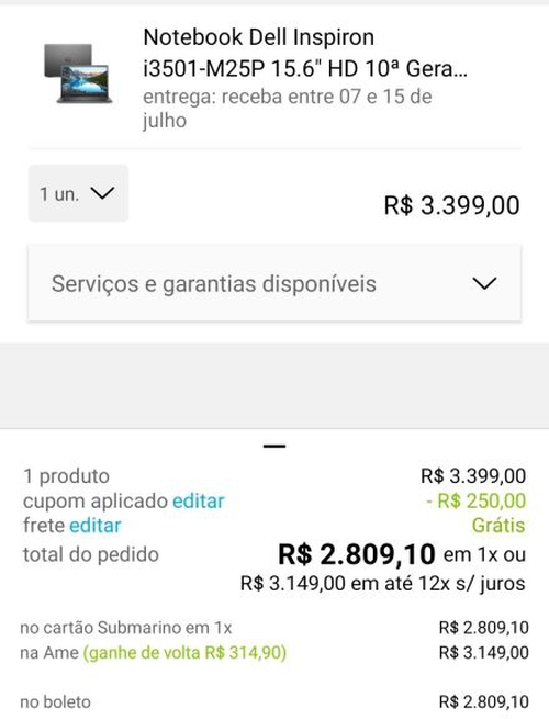 [APP+AME=R$2528] Notebook Dell Inspiron I3501-M25p 15.6" Hd 10ª Geração Intel Core I3 4gb 256gb Ssd Windows 10 | R$2809