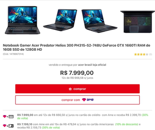 [APP + AME = R$5600] Notebook Gamer Acer Predator Helios 300 | R$7999