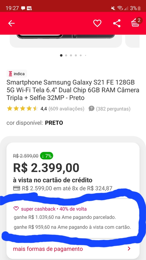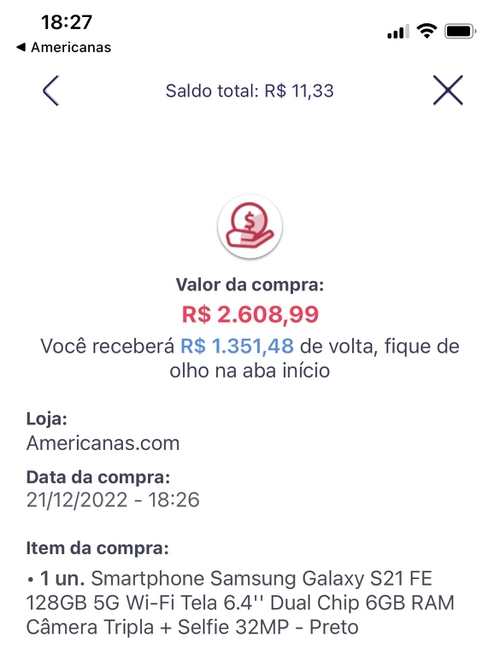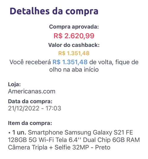 GALERA PRESTEM ATENÇÃO, quem não tá conseguindo chegar ao valor exato do cashback é por conta que antes da confirmação de pagamento no app da AME está com o valor errado. um exemplo mais cedo quando eu comprei o mesmo S21 FE e estava aparecendo somente 960 reais de cashback, e quando finalizei a compra falaram que iria cair o valor de 1247 Reais de cashback, espero ter ajudado...