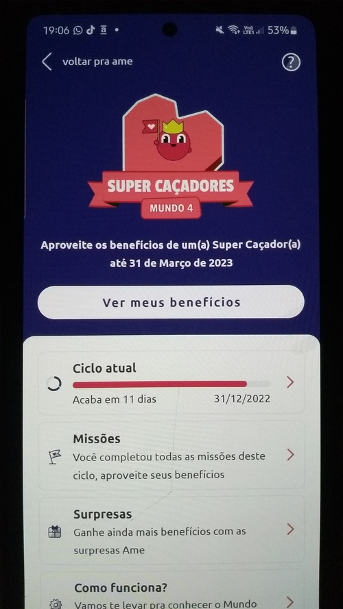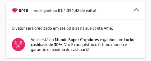 Para quem não é SC, eu fiz 2 tarefas agora no aplicativo ame e consegui mais 5% no cashback. Conforme sobe de nível mais cashback até chegar a 30% que o pessoal ta comentando