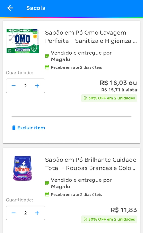 De 2 em 2 unidades, pelo app e para cliente ouro. Saiu este valor no PIX. Demais pagamentos estava saindo 16,03 cada. Sabão em pó Brilhante está saindo R$12 cada caso interesse pra alguém também🥰 Pra mim saiu 4 Omo e 4 Brilhante com frete grátis. Bom dia a todos!!