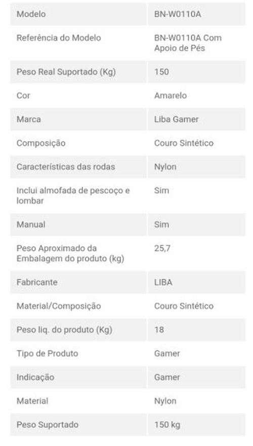 [APP] Cadeira Gamer Pro Liba Amarela e Preta - 0110 Com Apoio Retrátil | R$1196