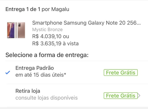 [APP-Cliente Ouro] Galaxy Note 20 256GB Dual Chip 8GB RAM Tela 6,7” 5G Bronze | R$3635