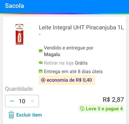 [App + cliente ouro] Leve 5 e pague 4 | Leite Integral UHT Piracanjuba 1L | R$2,87