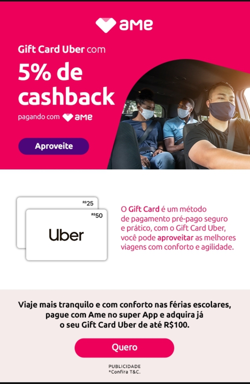 (APP) Compre Gift Card Uber com saldo do AME e ganhe 5% de cashback