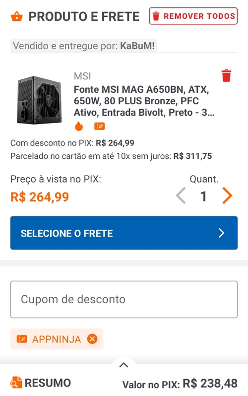 Ficou para o nordeste $269, o valor do desconto ficou pelo frete