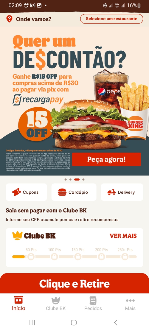 [APP] Ganhe R$15 OFF no Burger King com cupom da Recarga Pay em compras acima de R$ 30
