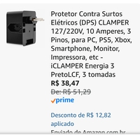 [App] Iclamper Protetor Contra Surtos Elétricos (DPS) Energia 3 Preto LCF, 3 tomadas, 10 Amperes, 3 Pinos, para PC, PS5, Xbox