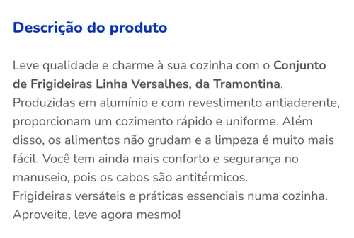 Tenho o jogo da Versalhes há um ano e não recomendo. O Teflon é frágil (mesmo aparentando ser melhor) pois queima com facilidade mesmo que tomando todos os cuidados (bucha específica, sabão neutro, temperatura baixa). Enfim, meu conselho é que se puderem investir em alguma linha superior, façam.. (Paris, Alegra ou Solar, Montreal, etc)