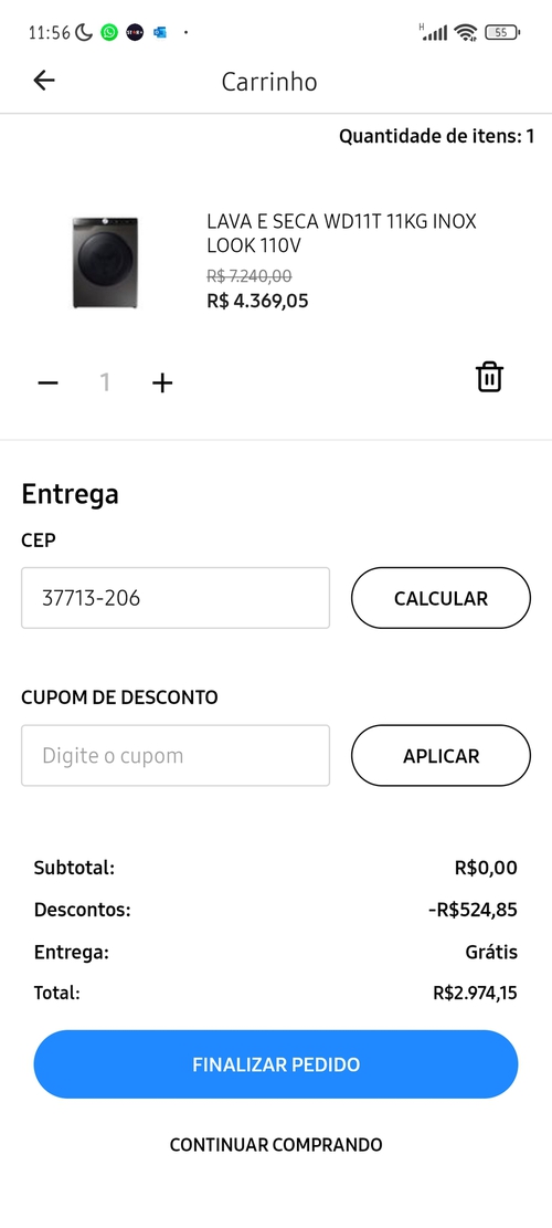 Cupom válido pra 110/220V, Inox e Branca, 11kg e 13kg (WD11T e WD13T). Pagamento a vista