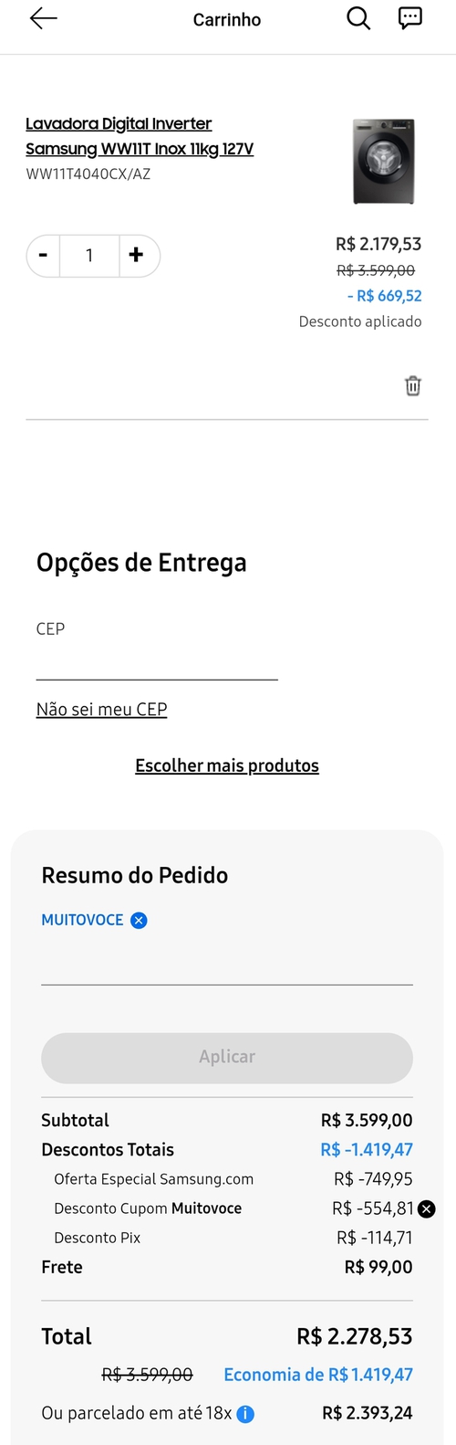 [App] Lavadora Digital Inverter Samsung WW11T Inox 11kg