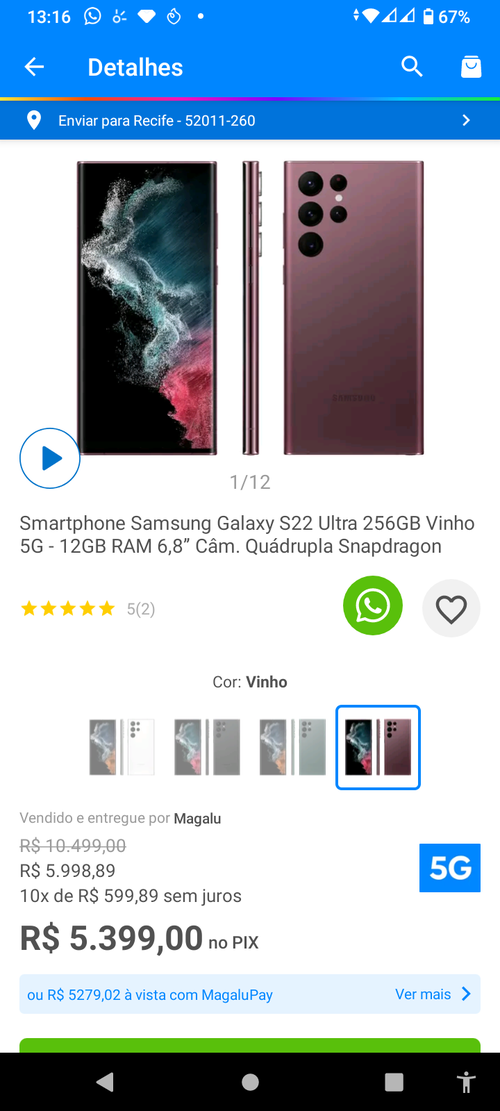 ATENÇÃOCaso o valor não aparece tenta limpar os dados de amarzenamento do app da MagaLu e depois abre diretamente pelo app e busca por S22 ultra ou pelo código 234440800.