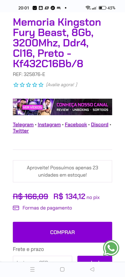 Na loja Enifler estão rolando as seguintes promoções em memória kingston 3200MHz