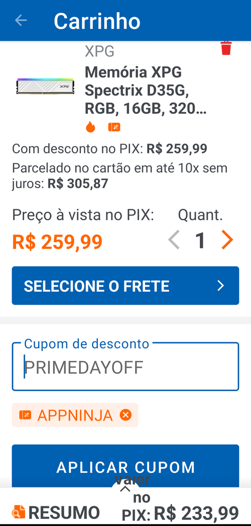 Preço à vista, utilizando cupom, através do aplicativo e pagando via PIX.
