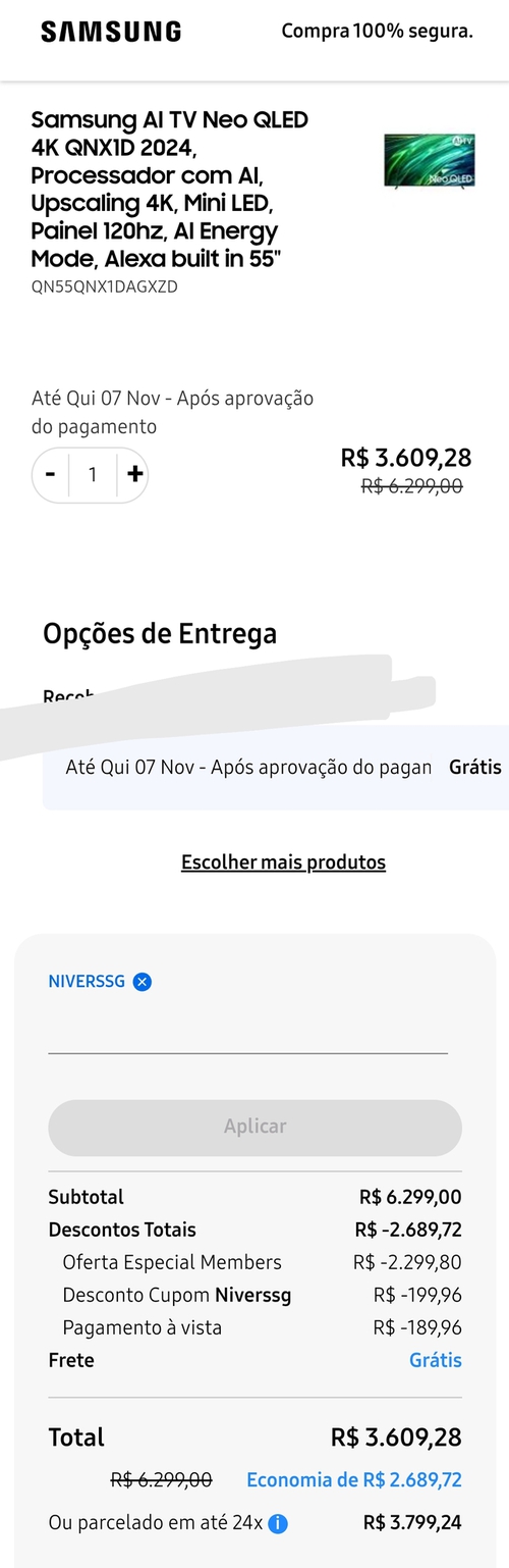 [App Members] Samsung AI TV Neo QLED 4K 55" QNX1D 2024, Painel 120hz, Processador com AI, Upscaling 4K, Mini LED, AI Energy Mode, Alexa built in