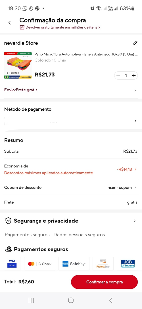 Aqui deu 9,24, desconto só de 0,49 em moedas.