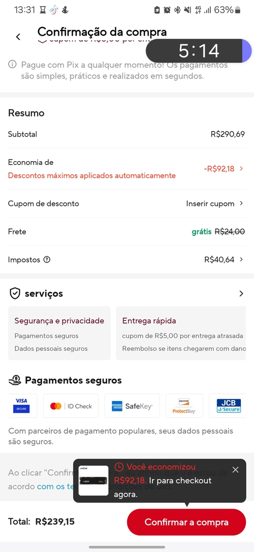 ao colocar o cupom aparece a msg de q não é possivel por motivo de segurança