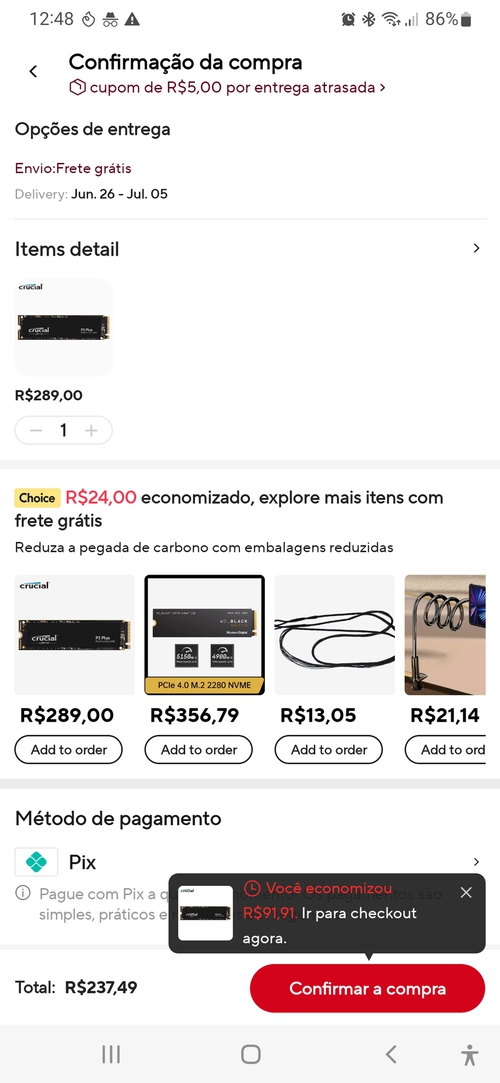 No final da minha compra ainda apareceu um bônus de 26 reais, nunca tinha visto isto. Acabei parcelando em 12x com preço final de 246 reais. Eu só tinha 1100 moedas na conta. Agora as 3h da madrugada acordei fui direto pro celular...... kkkkkk ver se tinha alguma promoção, só faltava esse SSD pra fechar minhas compras no Aliexpress....Acabou, 1 mês de vigília....kkkkkk