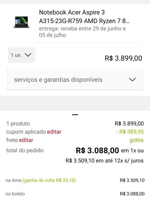 [APP] Notebook Acer Aspire 3 A315-23G-R759 AMD Ryzen 7 8GB RAM 256GB SSD RX Vega 10 15,6' Windows 10 | R$3088