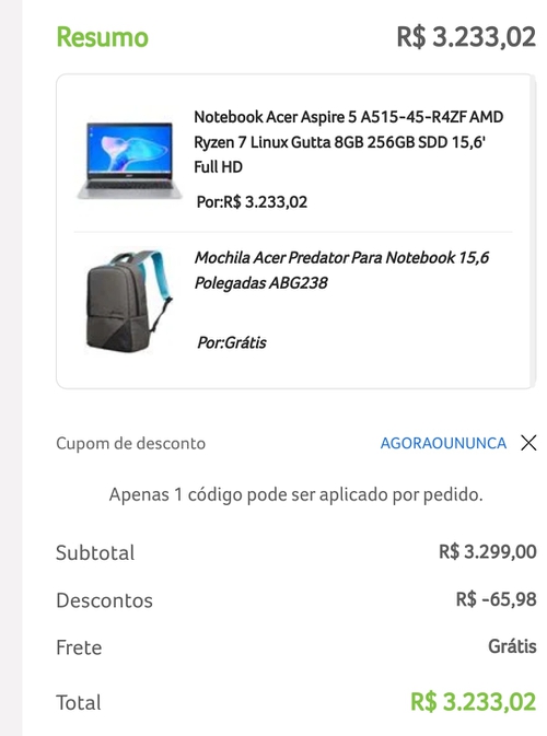 (APP) Notebook Acer Aspire 5 Ryzen 7 Linux 8GB 256GB sdd 15,6' Full HD