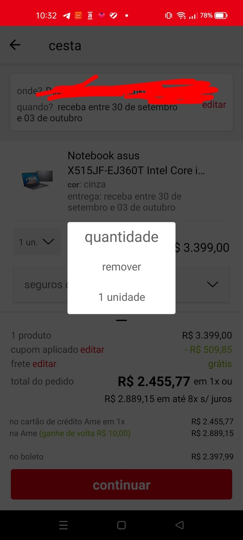 Ainda tem 6 unidades, alterei o valor pois não tinha percebido que pagando pelo boleto ficava mais barato. As vezes precisa limpar o cache do aplicativo pra funcionar o cupom. Pesquisa pelo Google que dá certo.