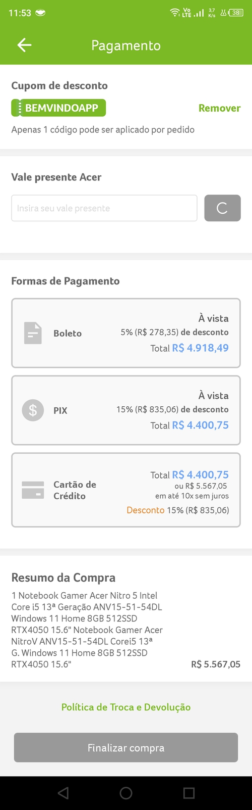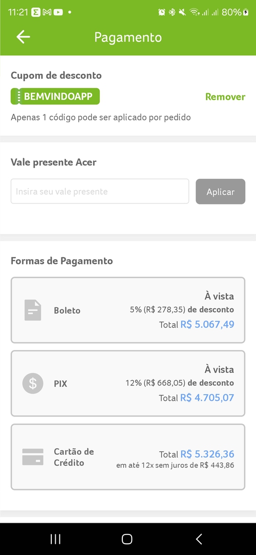 Acer tem algum problema comercial tudo bem mais caro se for pagar na porcaria do cartão