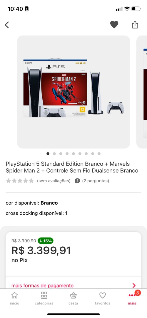 PlayStation 5 + Spider Man 2, R$3.399,91 no PIX.