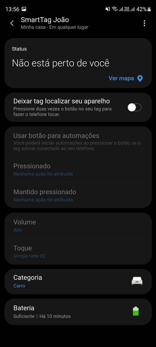 O bom é que se não tem um celular Samsung próximo dela, vc pode ativar um aviso de quando passar um próximo e envia uma notificação informando que a tag foi encontrada. Mostra o nível da bateria, dá pra trocar facilmente, é msm modelo de bateria de relógio e dura aproximadamente 300 dias, segundo a fabricante. Pra mim que não tenho seguro do carro, é uma boa forma de rastrea-lo em caso de roubo/furto.