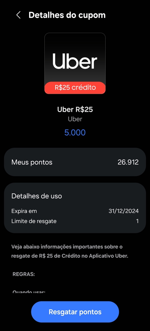 Resgate de Gift Card Uber de R$ 25,00 por 5 mil pontos no App Samsung Reward.