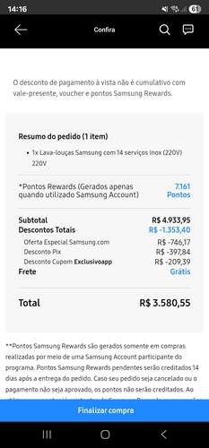Valor conseguido utilizando o APP Samsung Shop, pagando com Pix