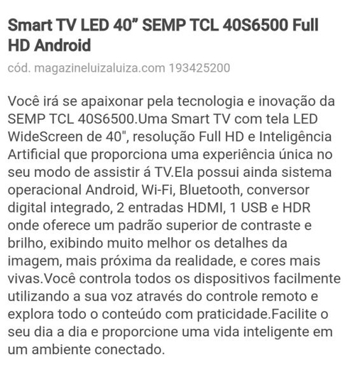 [app] Smart TV LED 40” SEMP TCL 40S6500 Full HD Android - Wi-Fi HDR Inteligência Artificial 2 HDMI USB - R$1378