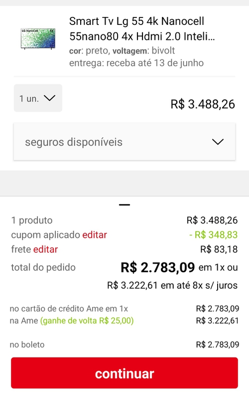 Não consigo de jeito nenhum chegar neste valor. Eu insiro o cupom, mas o valor de à vista no anúncio com 14% de desconto não aparece quando clico em comprar.