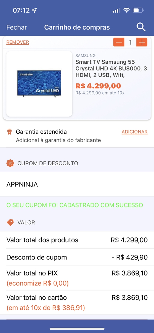 Use o cupom APPNINJA Formas de pagamento: em 10x no cartão de crédito, no boleto ou PIX. Atenção: Só é possível chegar no valor pelo APLICATIVO DA LOJA