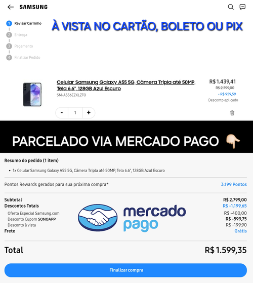 Excelente preço, comprei a dois dias por 1890 no ML. Vi a promoção do S23fe mesmo preço ontem e peguei e vou devolver o a55