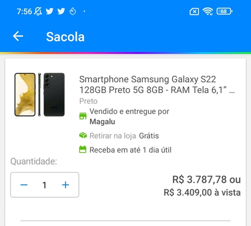 ATENÇÃOCaso o valor não aparece tenta limpar os dados de amarzenamento do app da MagaLu e depois abre diretamente pelo app e busca por S22 128GB ou pelo código 234437400.