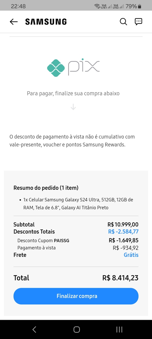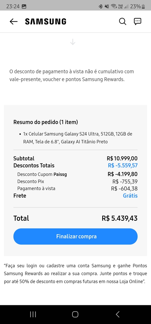Eu tinha comprado sexta feira o S24 ultra de 256gb na Amazon na promoção de 5850 a vista então cancelei a compra hj e consegui pega economizei 450 reais e ainda peguei celular com mais memória e da cor que eu queria estou feliz e satisfeito obrigado gente e obrigado quem. Postou a promoção