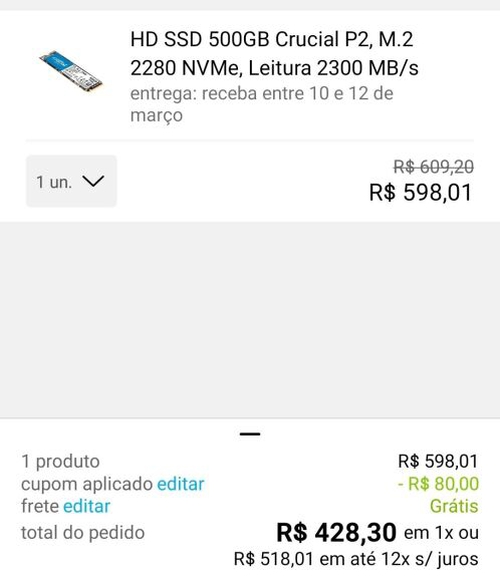 [APP] SSD Crucial P2, 500GB, M.2 NVMe, Leitura 2300MB/s, Gravação 940MB/s | R$428