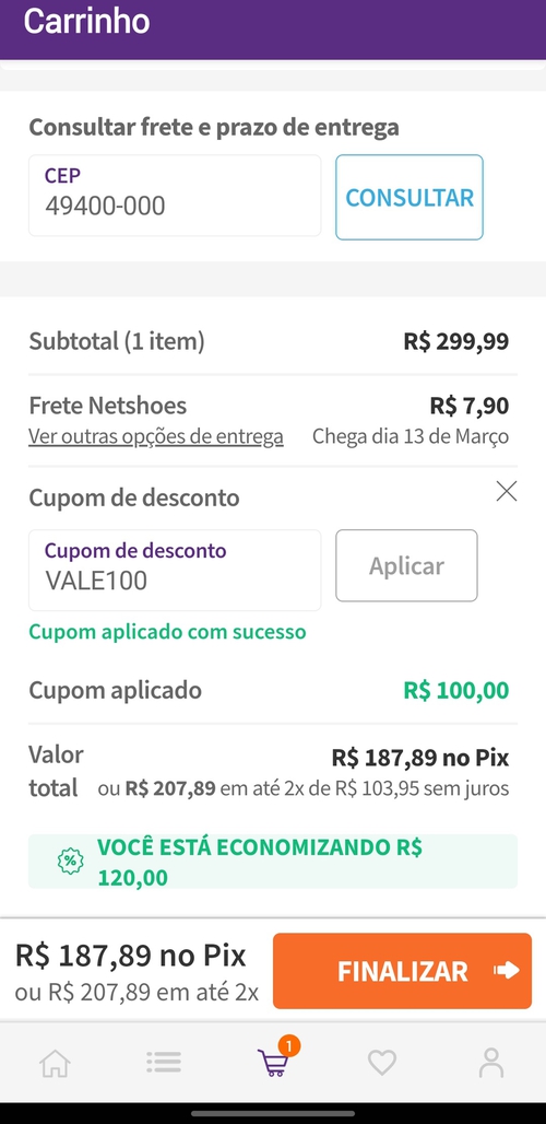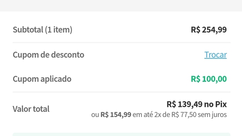 Cupom funcionou, mas no carrinho o preço final ficou em 180,00 no pix