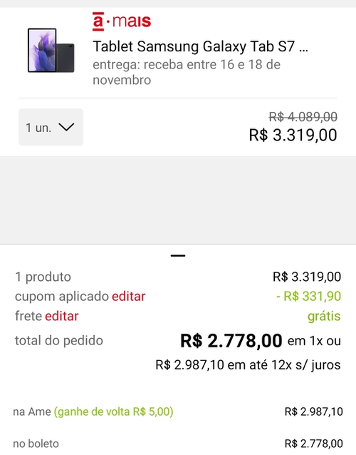 Tava aparecendo esse valor somente com 1x no boleto ou cartão, mas consegui esse preço parcelado em 12x. Muito obrigado!!